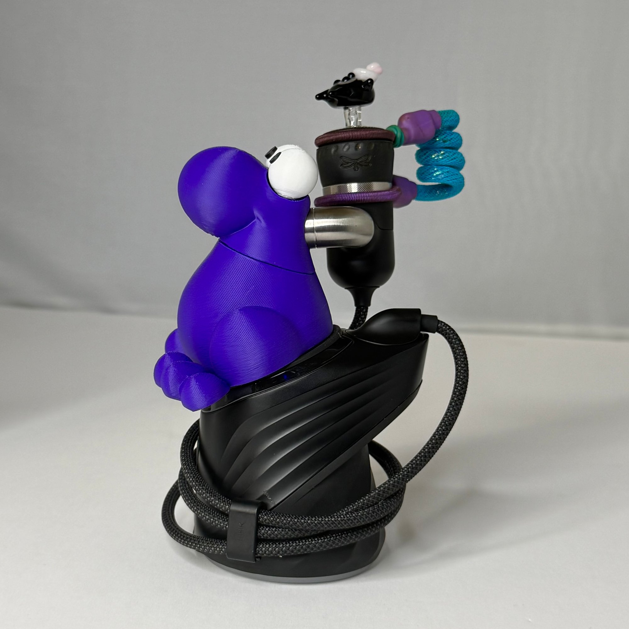 It fits firmly into your peak and has a spot designated for your atomizer. It also doubles as a little stash container with his head coming off revealing a hollow inside.